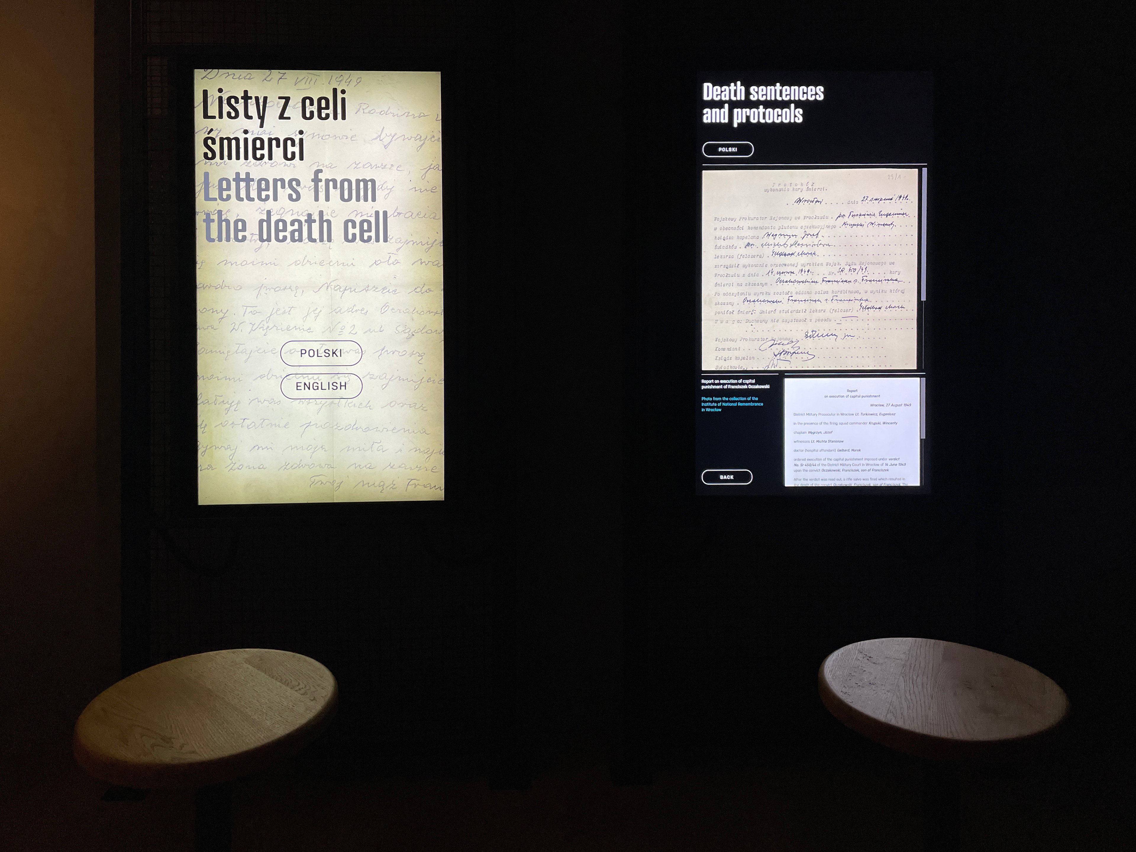 Dwie aplikacje na ekrany dotykowe o przekątnej 40'', będące elementem ekspozycji Cele Bezpieki w dawnej katowni ubeckiej mieszczącej się w gmachu Ministerstwa Sprawiedliwości w Warszawie.